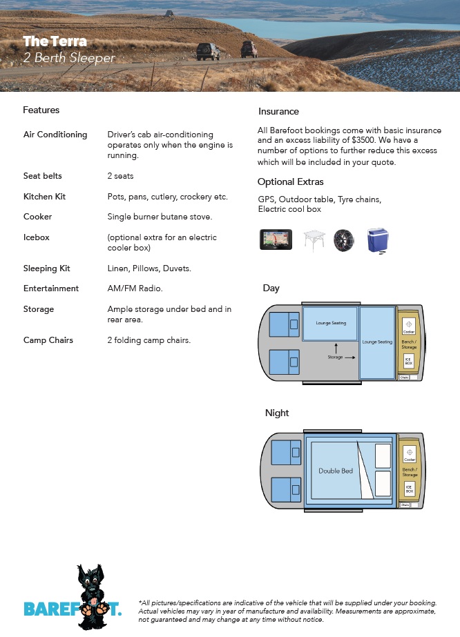 The Terra also offers the flexibility of being so cheap that you don’t feel as though you have to spend every night in the van, so if you are a bit over it or just need a nice shower and four solid walls around you then just splash out for a night and your budget won’t blow out.