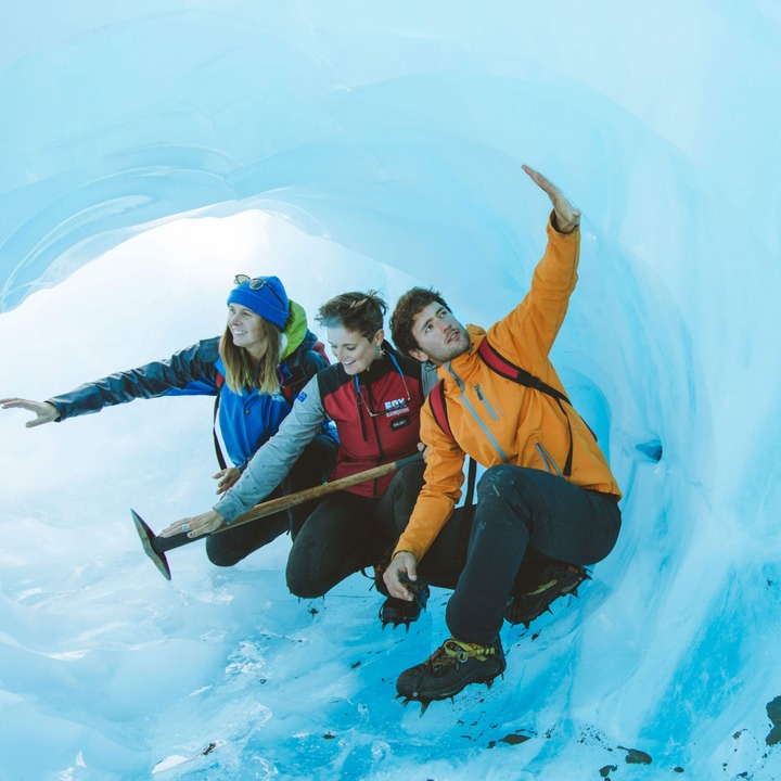 The fly-in, fly-out Flying Fox Heli Hike combines the excitement of walking on the Fox Glacier with the thrill of helicopter flights. By flying in you are able to access and explore a part of the glacier where its forces work hardest and often create spectacular ice caves and arches.