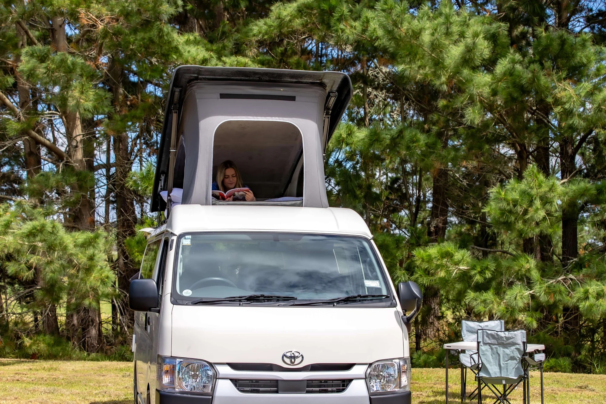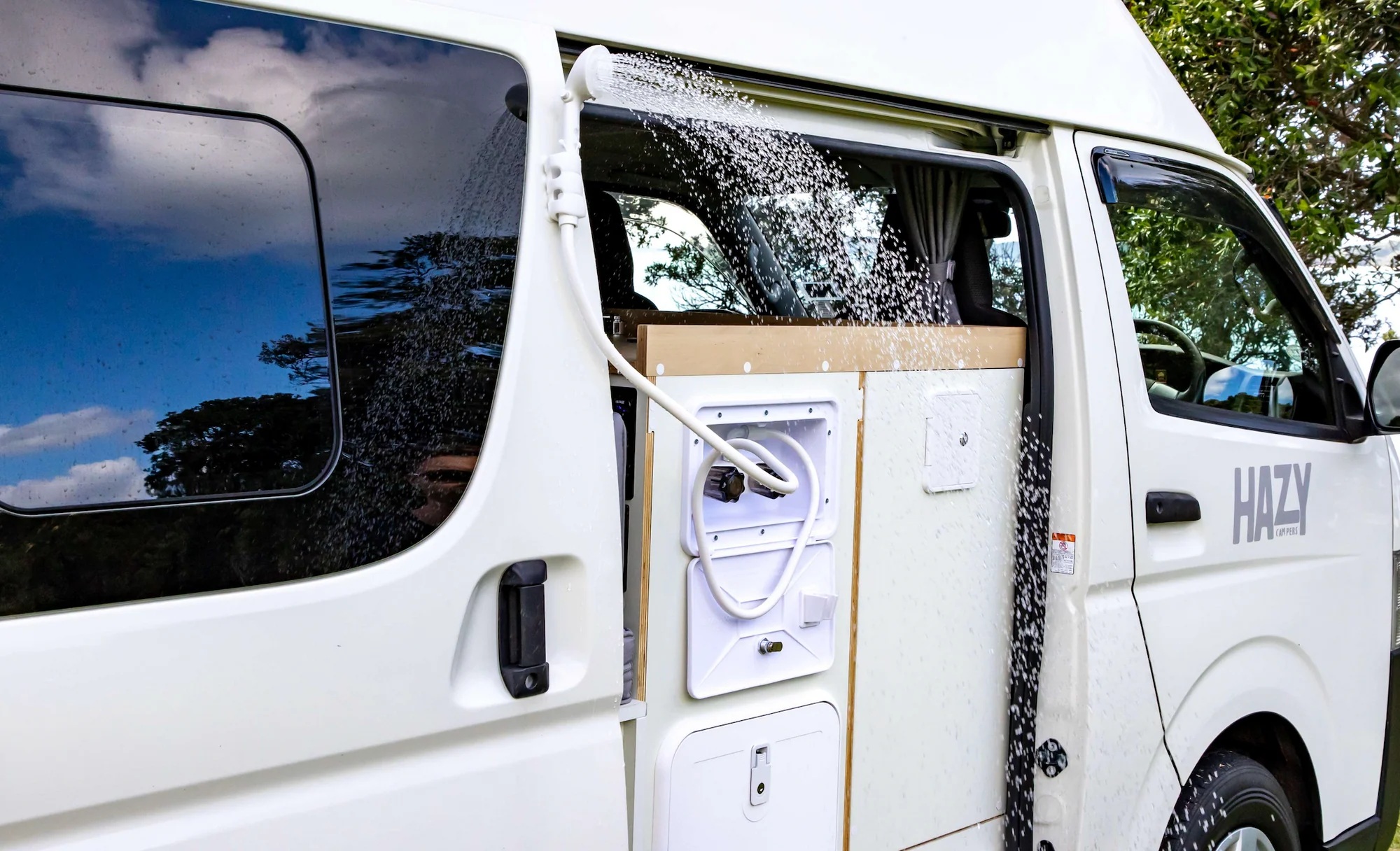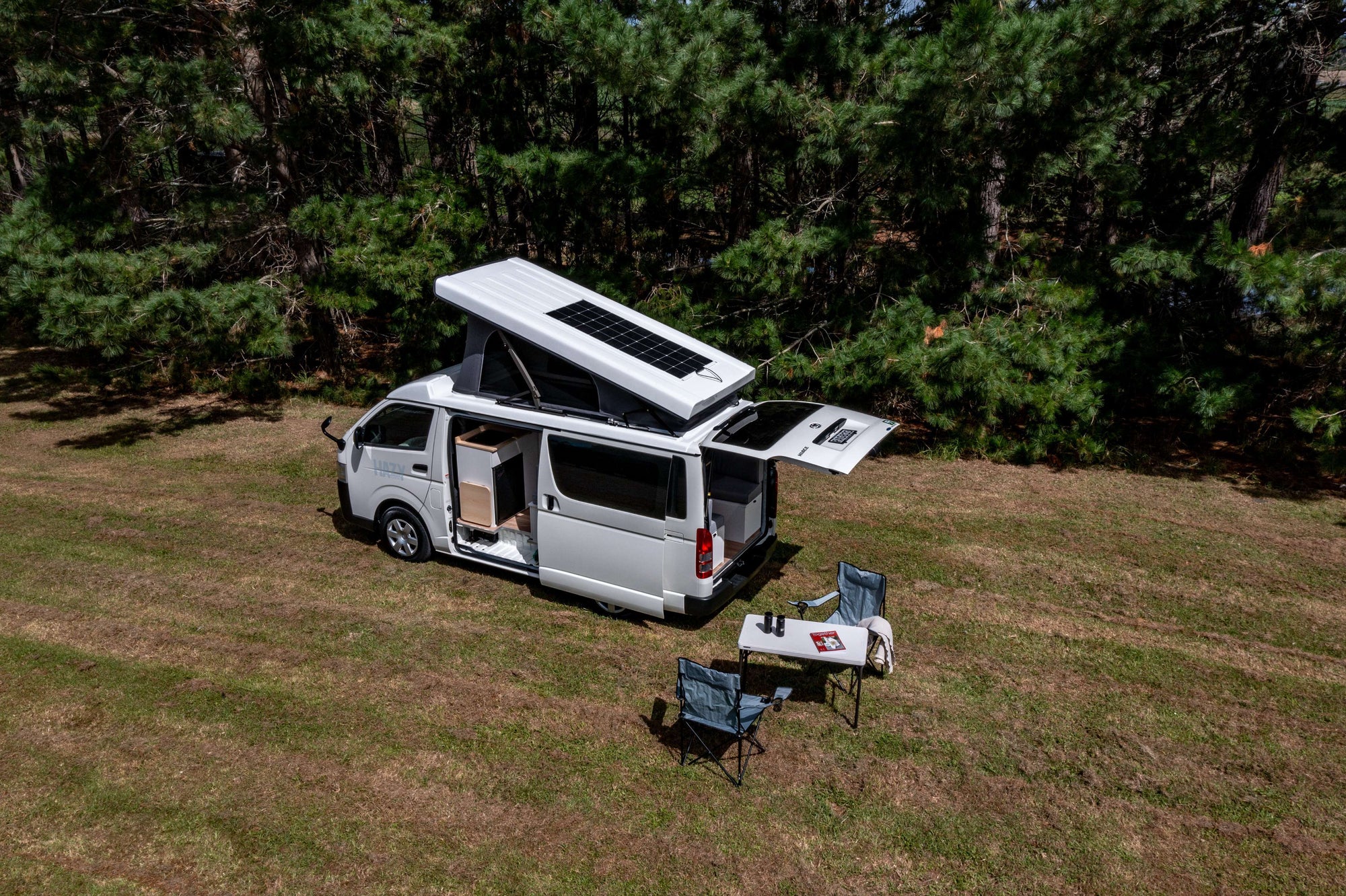 What’s Inside Our Campervans: * Comfortable Sleeping: Spacious and cozy interior, easily accommodating 2 people. * Fresh Sheets and Towels: Brand new for every trip. Keep them as a souvenir or we’ll donate them to women’s refuge. * Fully Functional Kitchen: Equipped with two portable gas cookers for off-grid, induction cooktop (when plugged in at a powered campsite), sink, fridge, and essential cooking utensils for delicious meals on the go. Power and Connectivity: * 12v Power System: Powered by a lithium dual battery setup for reliable off-the-grid power, keeping your devices charged and your appliances running. * Solar Power System: Harness the power of the sun for an eco-friendly energy source. * 240v Power Option: Connect to campsite power supplies for full access to electrical appliances. Water and Waste Management: * Generous 42L Fresh Water Tank: Easy to refill with a standard hose. * Simple Waste Water Drainage: Hassle-free system for easy maintenance. Outdoor Perks: * Outdoor shower - great for rinsing off sandy feet! * Deck Chairs and Table: Two deck chairs and an outdoor table for chilling and dining al fresco. Why You’ll Love Hazy Campers: * Certified and Safe: Fully compliant with new freedom camping regulations, certified for electrical safety, and road legal. * Convenience: Located in central Auckland, just 20 minutes from the airport. * Modern Fleet: All vehicles are 2018 or newer with low mileage. * Unlimited KMs: Travel as far as your adventure takes you. * Extra Comforts: New sheets, towels, and more. * Great Deals: We offer discounts for hires over a month. Please contact us to discuss. * 100% Kiwi Owned and Operated Experience the freedom of the open road with Hazy Campers. And if your preferred dates aren't available, be sure to check out our other camper van listings.
