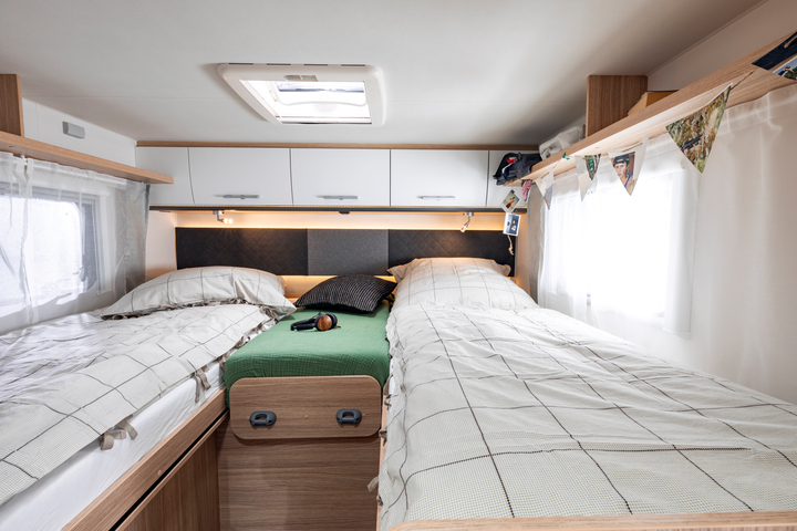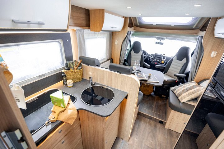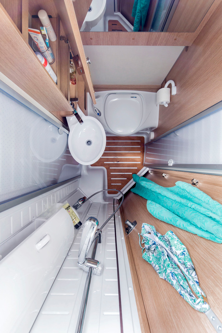 The passenger seats are part of the comfortable four-seater dinette situated directly behind the cab, so young children are seated directly behind the driver and passenger when travelling. The layout is completed with a washroom with a shower over toilet cubicle, and a modern, spacious kitchen in centre of the vehicle. There are two beds. One double island bed at the rear of the vehicle (option to split this into two singles), and a second drop-down double over the dinette.