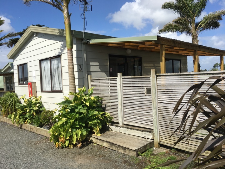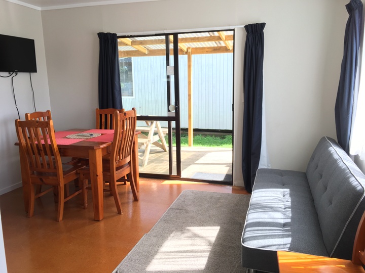 The main living area has a fold down couch, dining table and chairs, and a TV. The spacious deck is enclosed and has outdoor furniture to relax upon and you can take in the surrounding sea air and sunshine here at Clarks Beach Holiday Park.