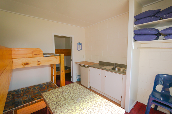 The living area includes: dining table and chairs, a kitchenette with a small fridge (with icebox), sink toaster, jug, crockery & cutlery for eight people. Our Kitchen, TV lounge and park ablutions block is a stone’s throw from your Cabin.