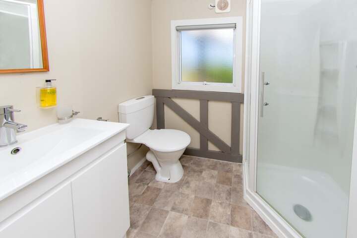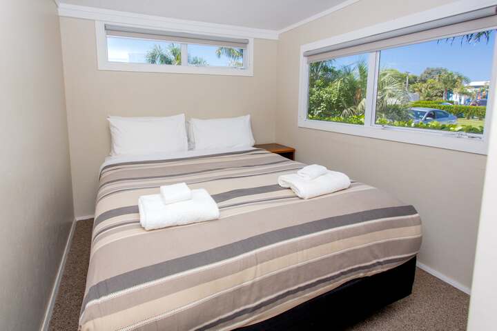 These older style lodges are setup with a Queensize bed (bedding and towels provided), a further bunk room with two sets of bunks, a small kitchette with a microwave, hot plate, fridge/freezer, cooking utensils and TV. Shower and toilet is in the room. There is indoor-outdoor seating with a small deck on the front of the unit.