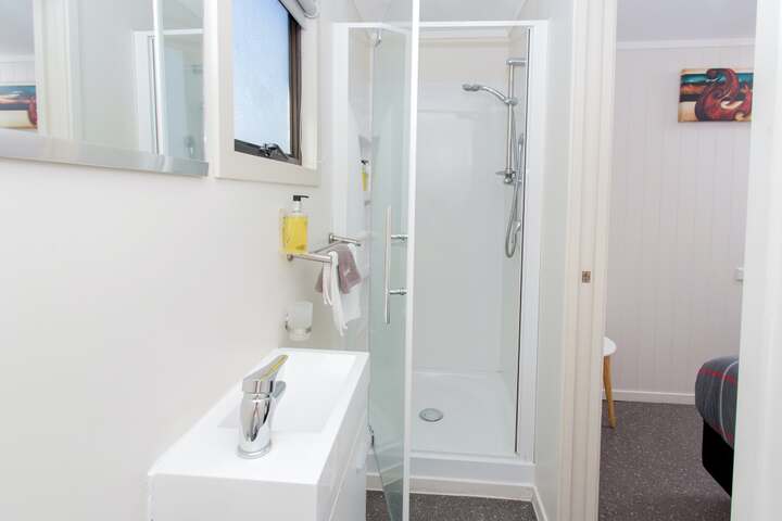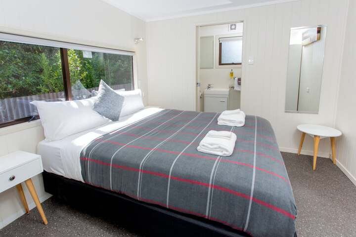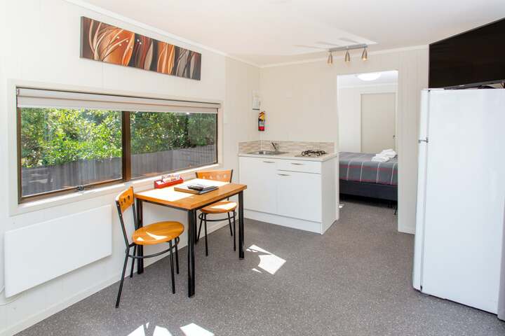 This older style lodge is setup with a Queensize bed (bedding and towels provided), a small kitchette with a microwave, hot plate, fridge/freezer, cooking utensils and TV. Shower and toilet is in the room.