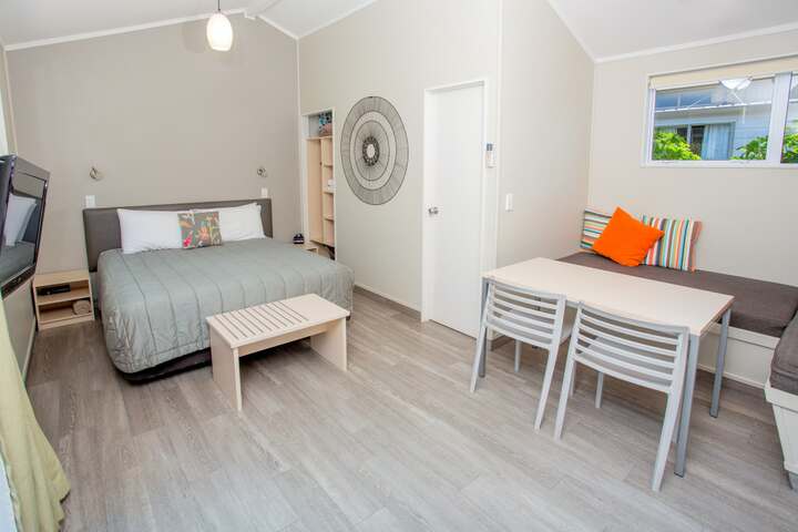 The units contain one king-sized bed in the main living room, two single beds in the bedroom, sleeping up to four guests. Each unit has its own en-suite bathroom, with shower and toilet.-
