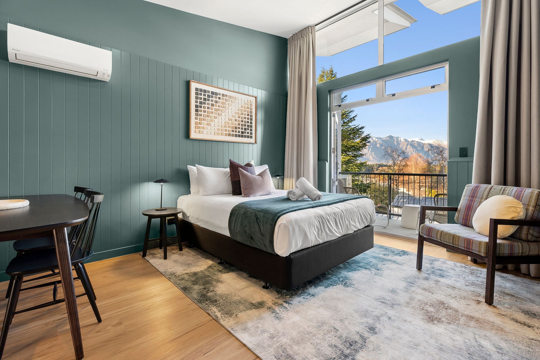Relax in this spacious alpine-style retreat, ideal for families or groups of up to six. It features a queen bed in the main area and two sets of single bunks in a separate bedroom. Enjoy the crisp mountain air from your private patio, or stay comfortable indoors with a heat pump/air-conditioning unit. The unit also includes a private bathroom, smart TV, dining area, bar fridge, and kettle. Just a short walk from Queenstown’s vibrant center, it offers a cosy and convenient base for your stay.