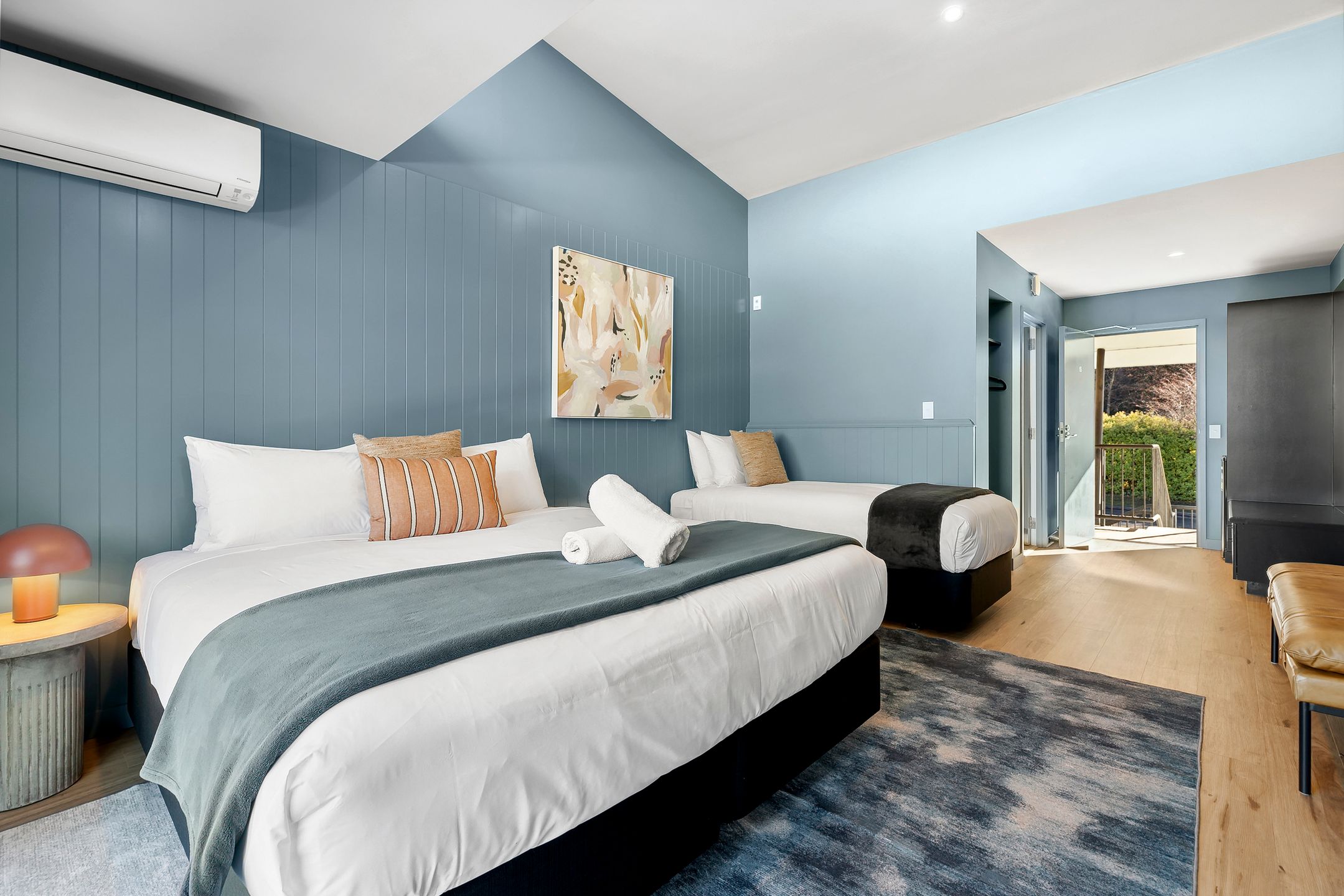 Modern and stylish, this refurbished studio is perfect for up to three guests. It features a super king bed (which can be split on request) and single bed, plus heat pump/air conditioning, private bathroom, and a smart TV. Enjoy a bar fridge and tea/coffee station for added convenience. Upper-level rooms boast vaulted ceilings and expansive views, while ground floor options offer outdoor seating. Just a short stroll from town, this studio is a chic base for your Queenstown adventure.