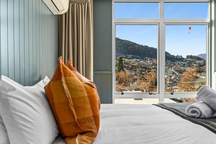Upstairs rooms offer soaring ceilings and panoramic views of Queenstown and The Remarkables, while ground-level studios provide relaxing patio seating.