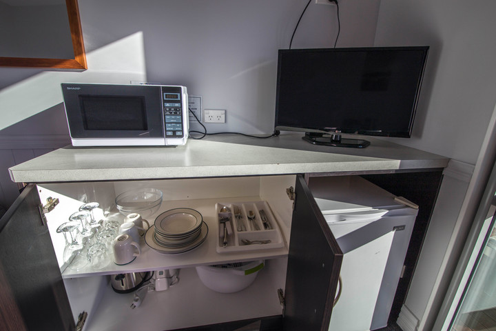 The unit is equipped with breakfast making facilities, including a fridge, electric jug and toaster as well as a microwave.
