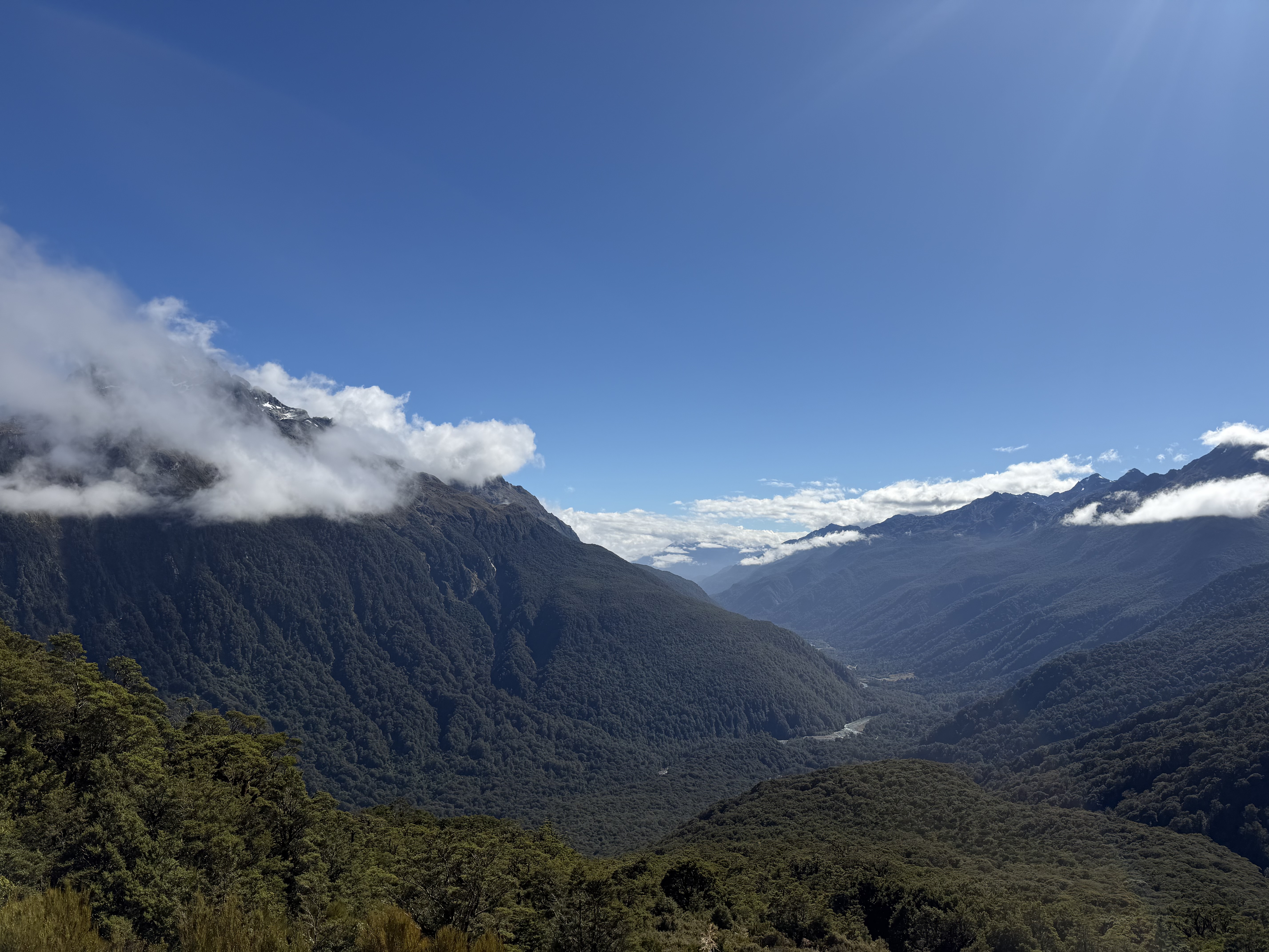 Few places summon such vast enthralling views as Key Summit. Looking north is the Hollyford Valley, flanked to the east by the Alisa Mountains and to the west by the Darrans. Above the Lake Marian bowl are the pyramidal Mount Christina and Mount Crosscut. Looking east from the Lake Marian lookout is the Greenstone Valley, with the Eglington sneaking in to the south.
