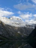 The Lake Marian (695 metres) is a total gem near the Hollyford Road. Nested in a bowl, surrounded by 1500 metre high sheer granite walls, scoured to the vertical by glaciers, the remnants of which cling tenaciously to the mountain tops and sprout myriad small waterfalls - need we go on!