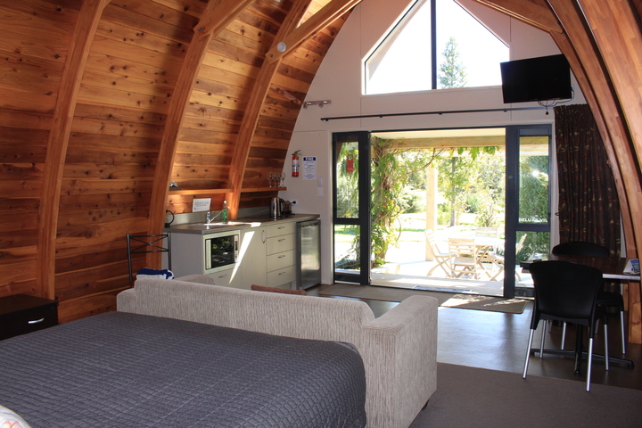 These uniquely designed villas are handcrafted from New Zealand grown timber. They are open plan with king bed and sofa, kitchen, bathroom and TV.
