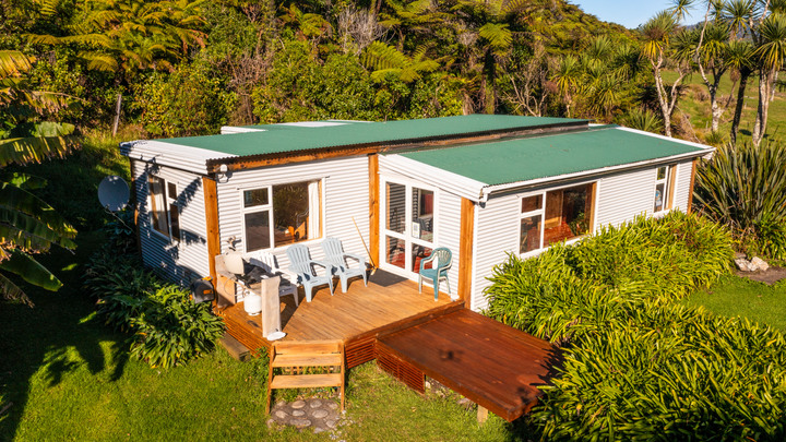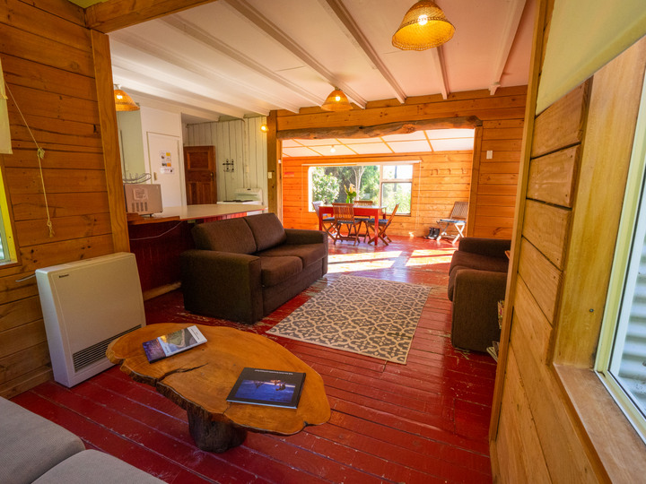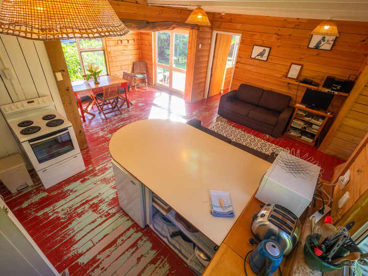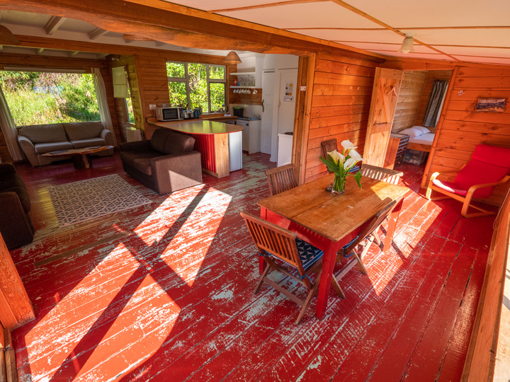 Its private, sheltered location makes it a great place to relax and get away from it all. The open plan lounge/kitchen/dining is comfortably furnished and well equipped.
