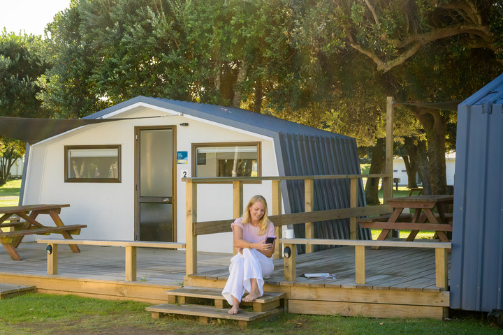 Featuring a double and single bed, basic kitchenette, table and chairs, and a picnic table just outside, it’s a practical spot for budget-conscious travellers. Communal bathrooms are just a short walk away.