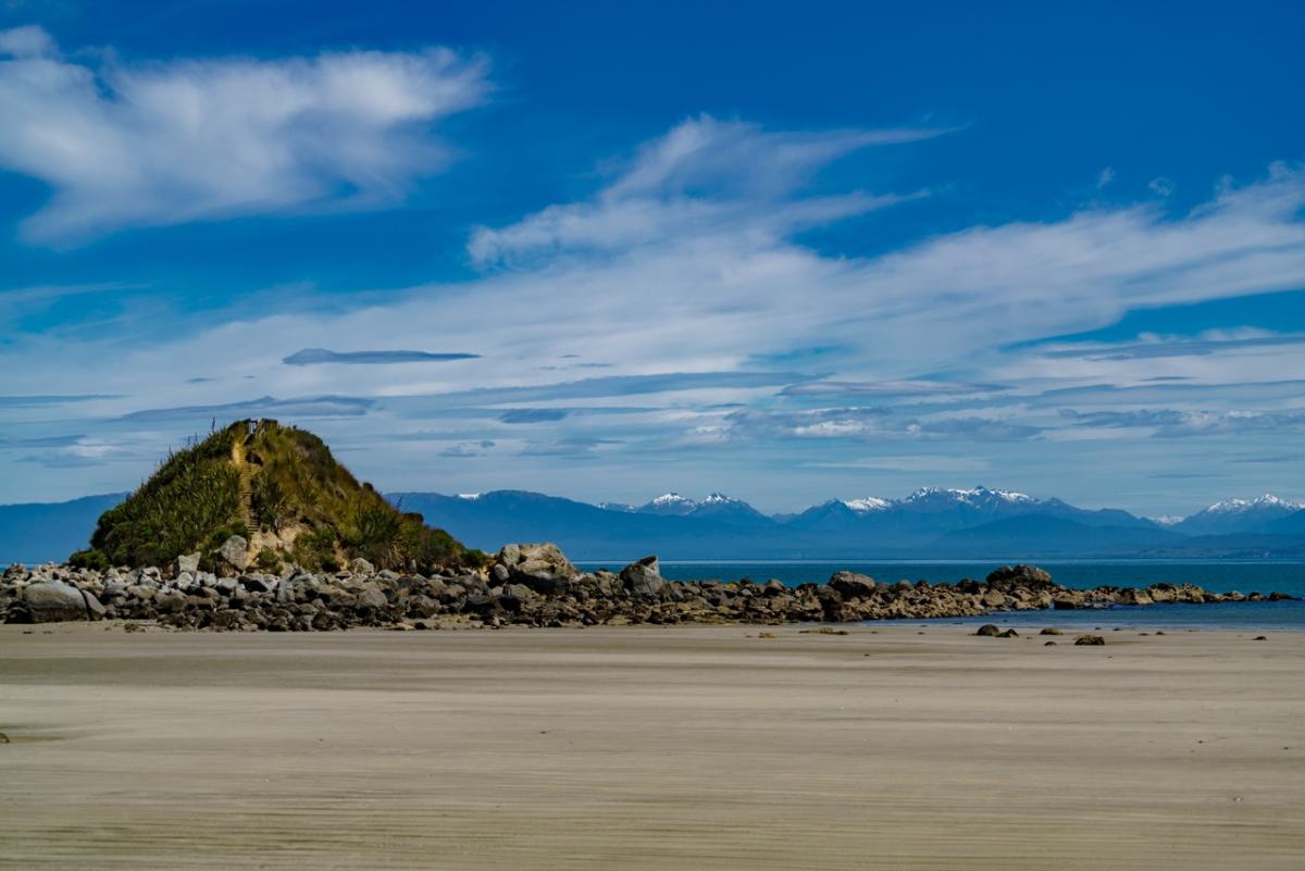 Monkey Island can be reached by foot at a low tide, and offers good views of the beach and distant mountains.