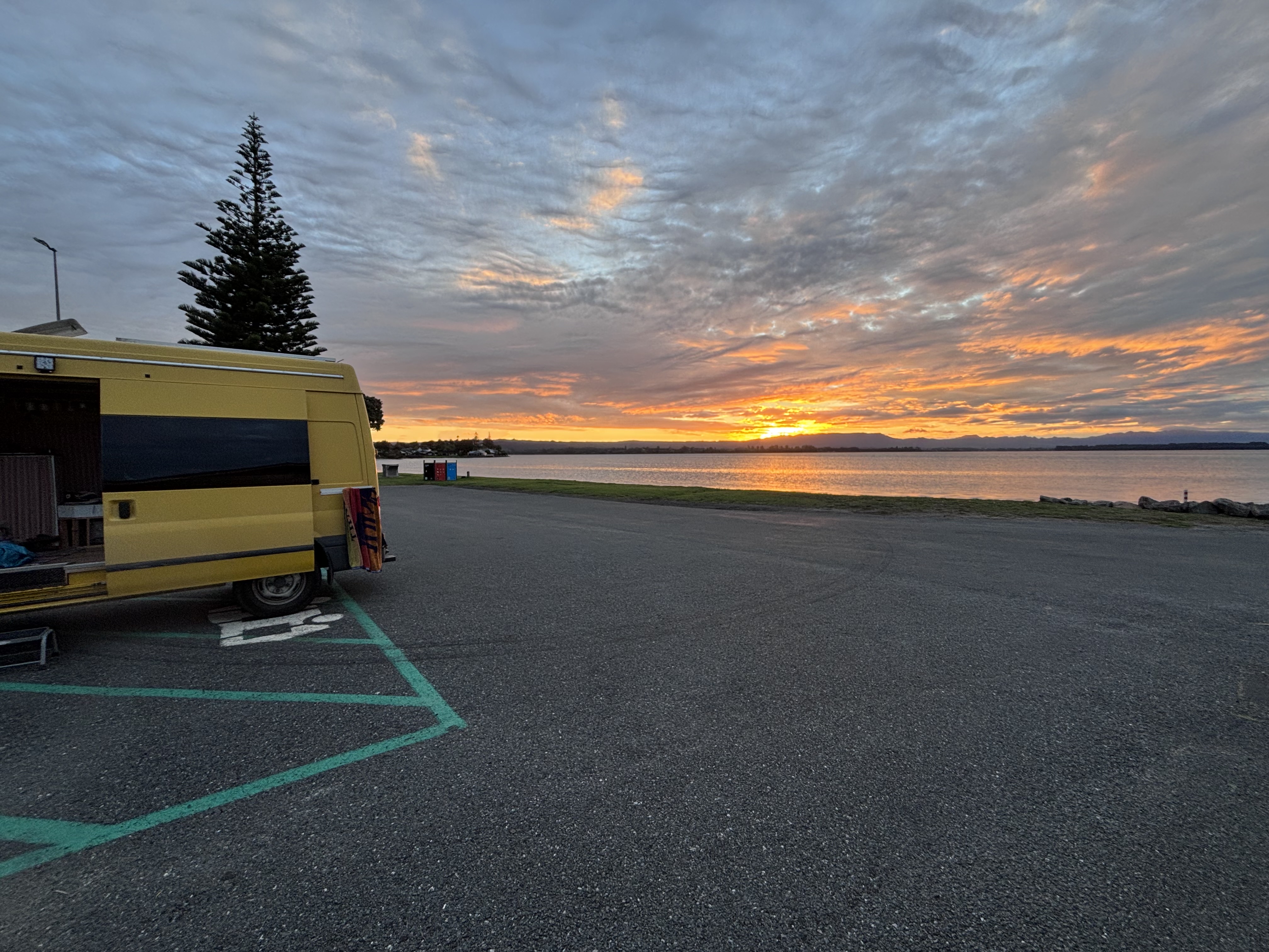 Got there early avo, very windy so perfect for kite surfers(and there were plenty on the water) so we got to watch that. You have to go all the way to the end to turn your campervan tho. Kids had after school sports activities which was fun to watch(made us miss our granddaughter). Beautiful view of the ocean, clean toilets, very clean park except someone didn't pick up their dog shit which was on the lawn right where the designated area is(as there's only 3 designated areas for self contained vehicles. Gates are locked which we were happy with especially given the fact we're 1st timers. Wake up to lots of people exercising in the morning and cool breeze to offset the hot early morning sun.