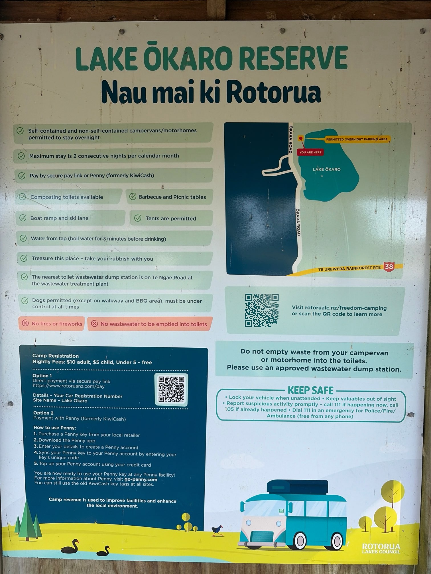 There is a permanent advisory to avoid recreational water contact due to blue-green algae blooms in the lake Okaro. 16 $ for 2 berth Motorhome.