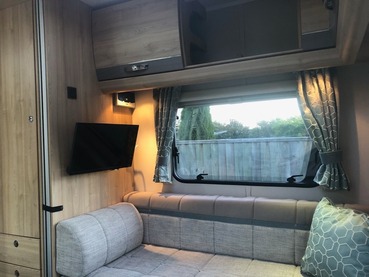 It has a TV with a built in DVD player, 19” screen. It also has an fully automatic satellite dish to find the TV stations